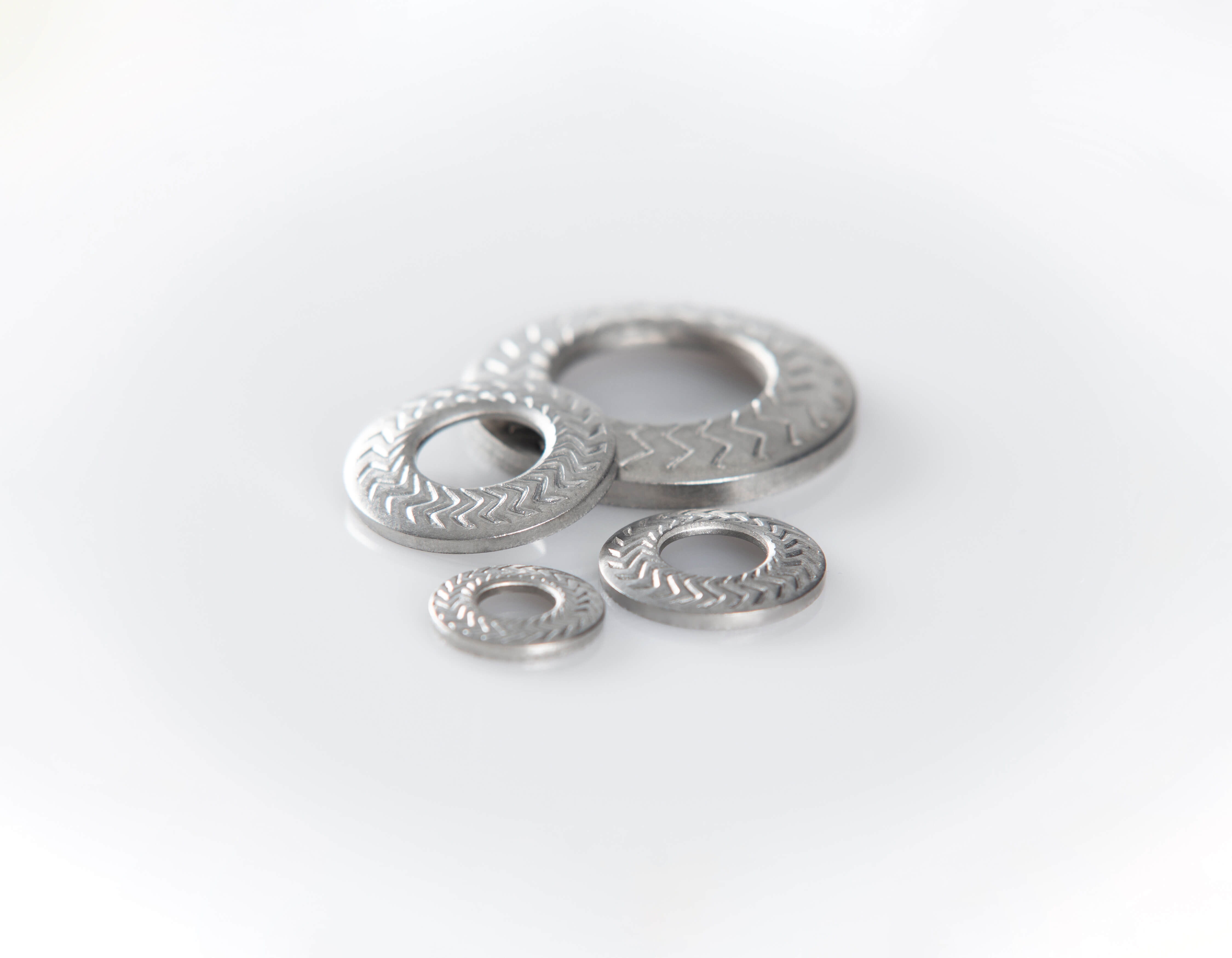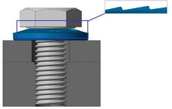 Formschlüssig sperrende Wirkung durch die Verzahnung unter dem Schraubenkopf bzw. an der Mutter.